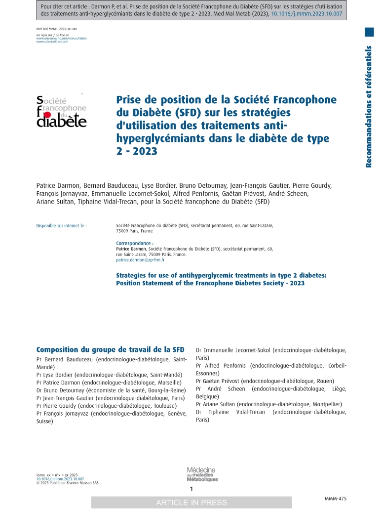Prise de position de la SFD sur les stratégies d'utilisation des traitements antihyperglycémiants dans le diabète de type 2 - 2023